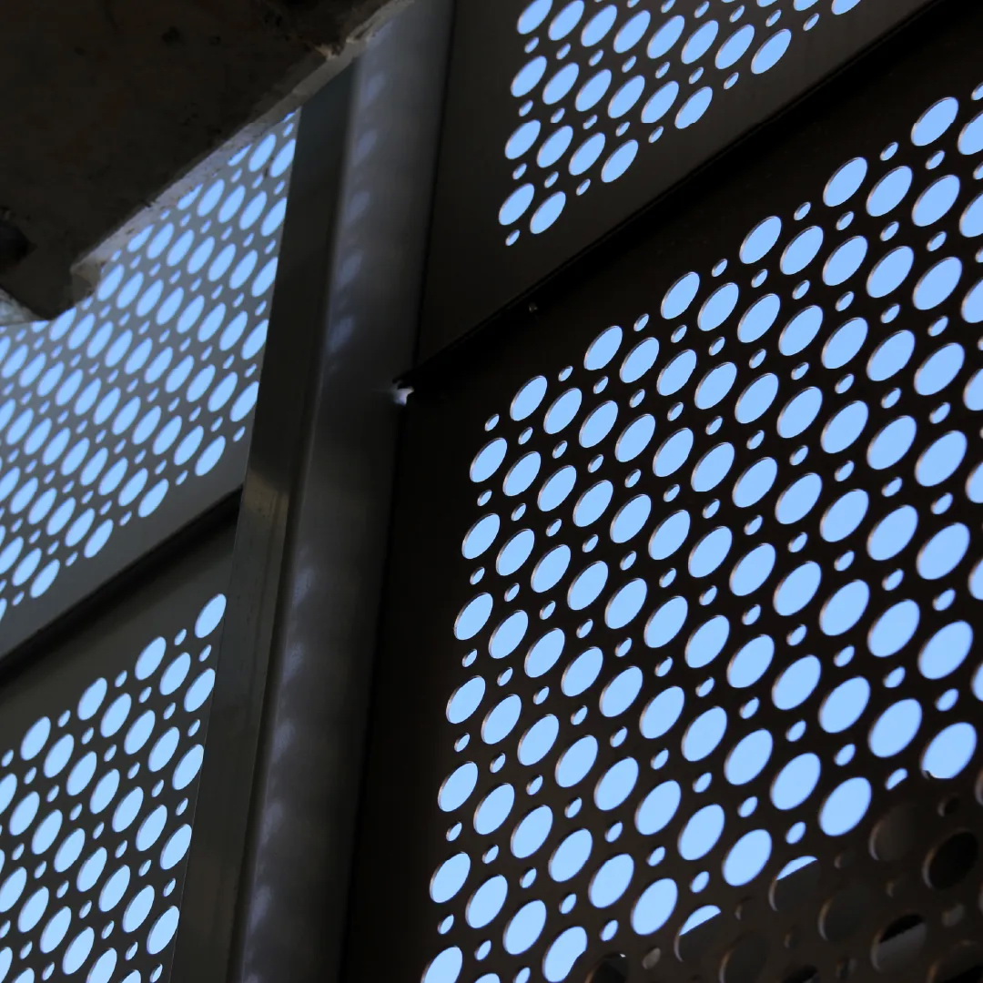 Geometric round pattern. General purpose perforated metal sheet with 2 sizes of holes to create an attractive round pattern. It has a variety of functional uses: Seive, vertical screening, grill, infill panels and is also a great decorative screen.